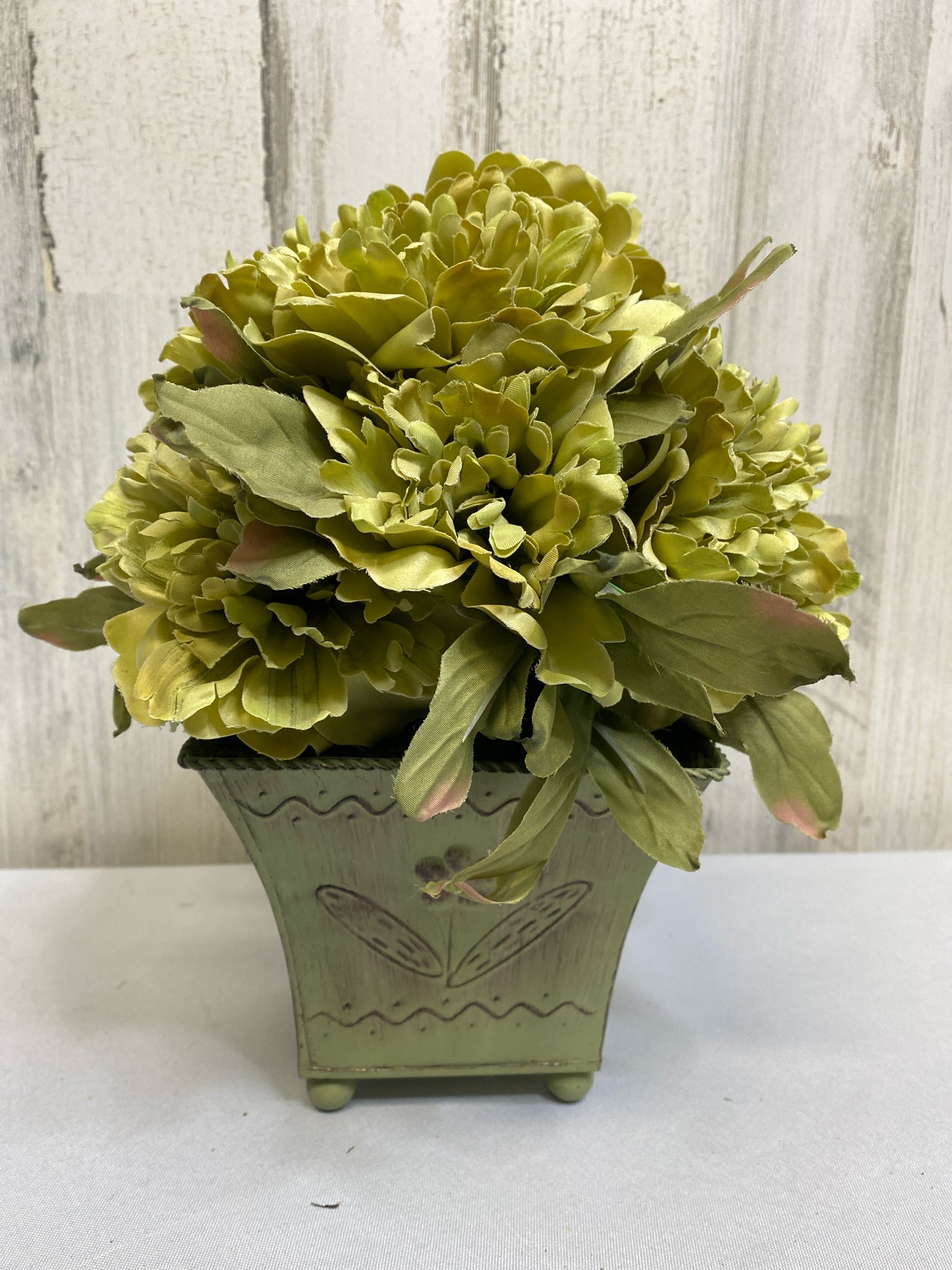 11" green Floral Arrangement in Metal Planter