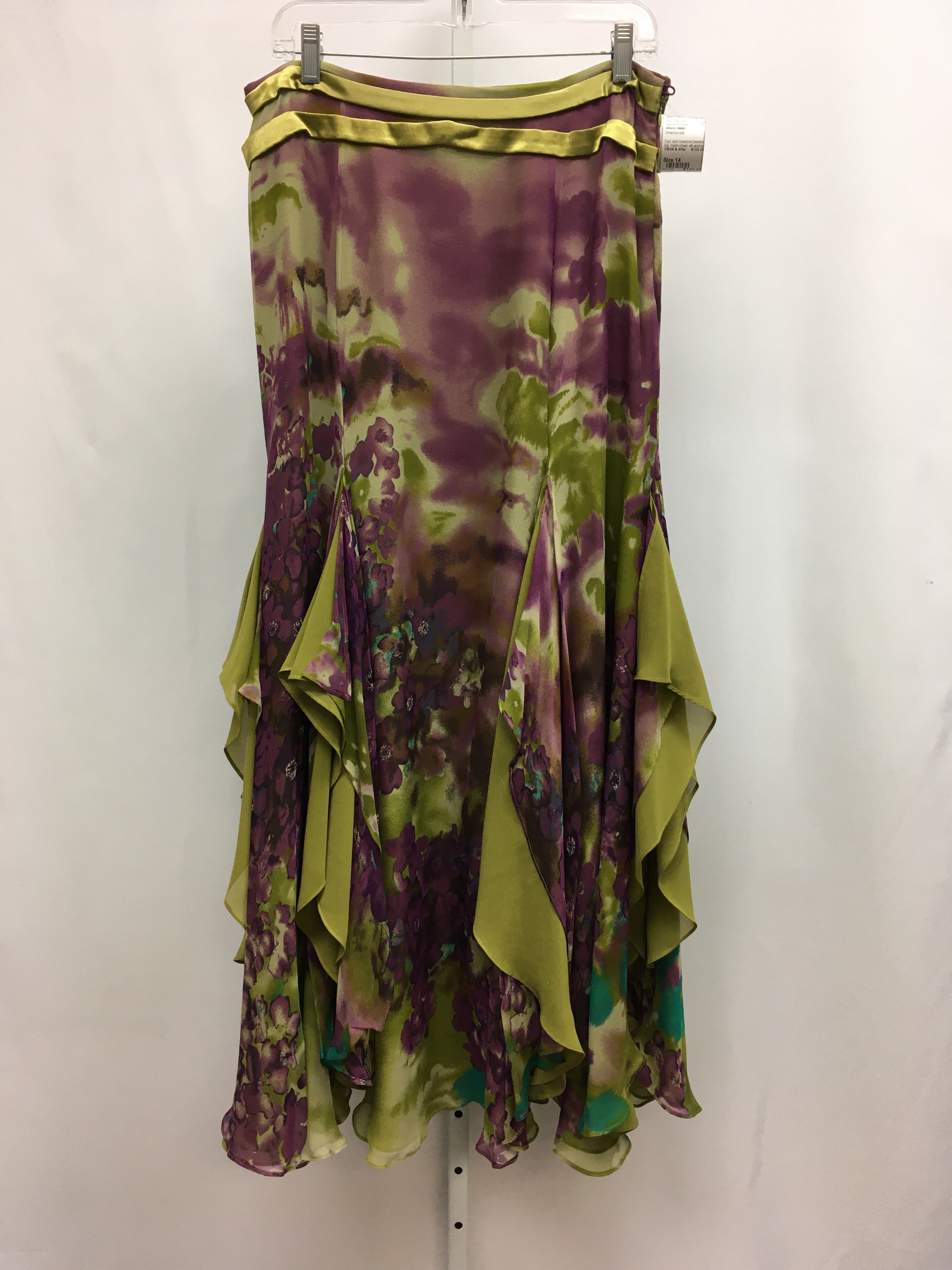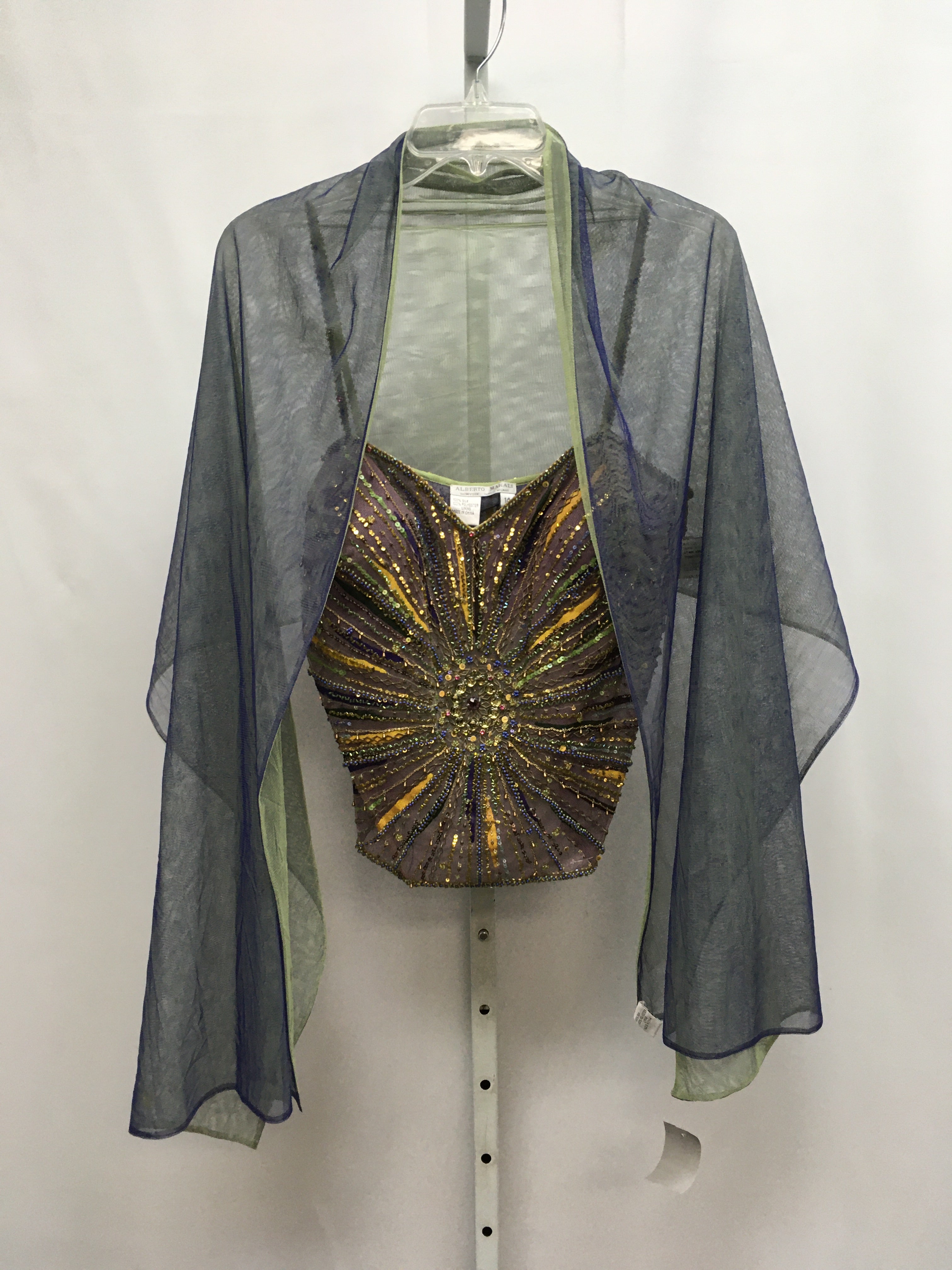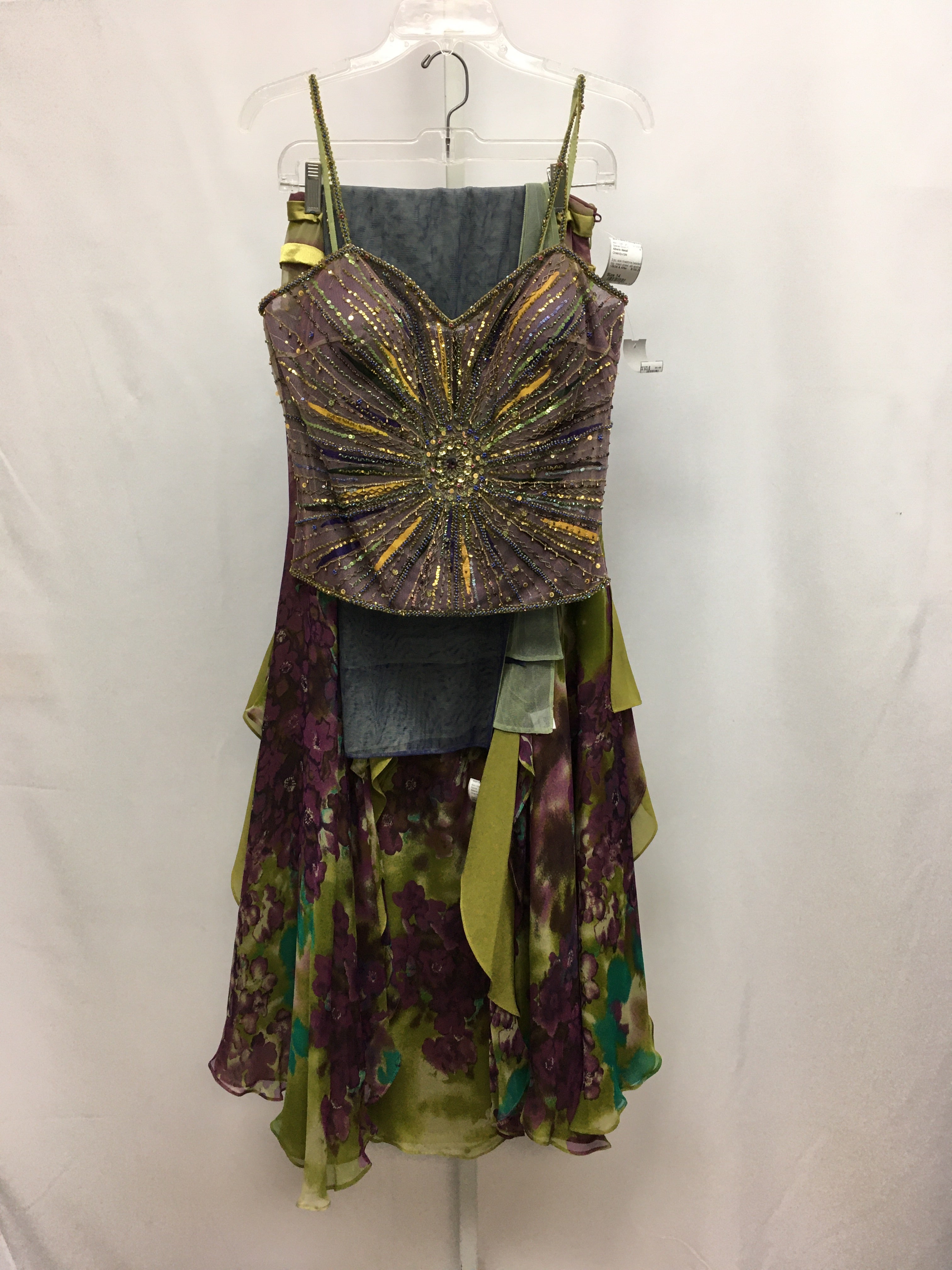 3 pc, siok rinestone beaded top, mesh shawl, silk abstract print skirt