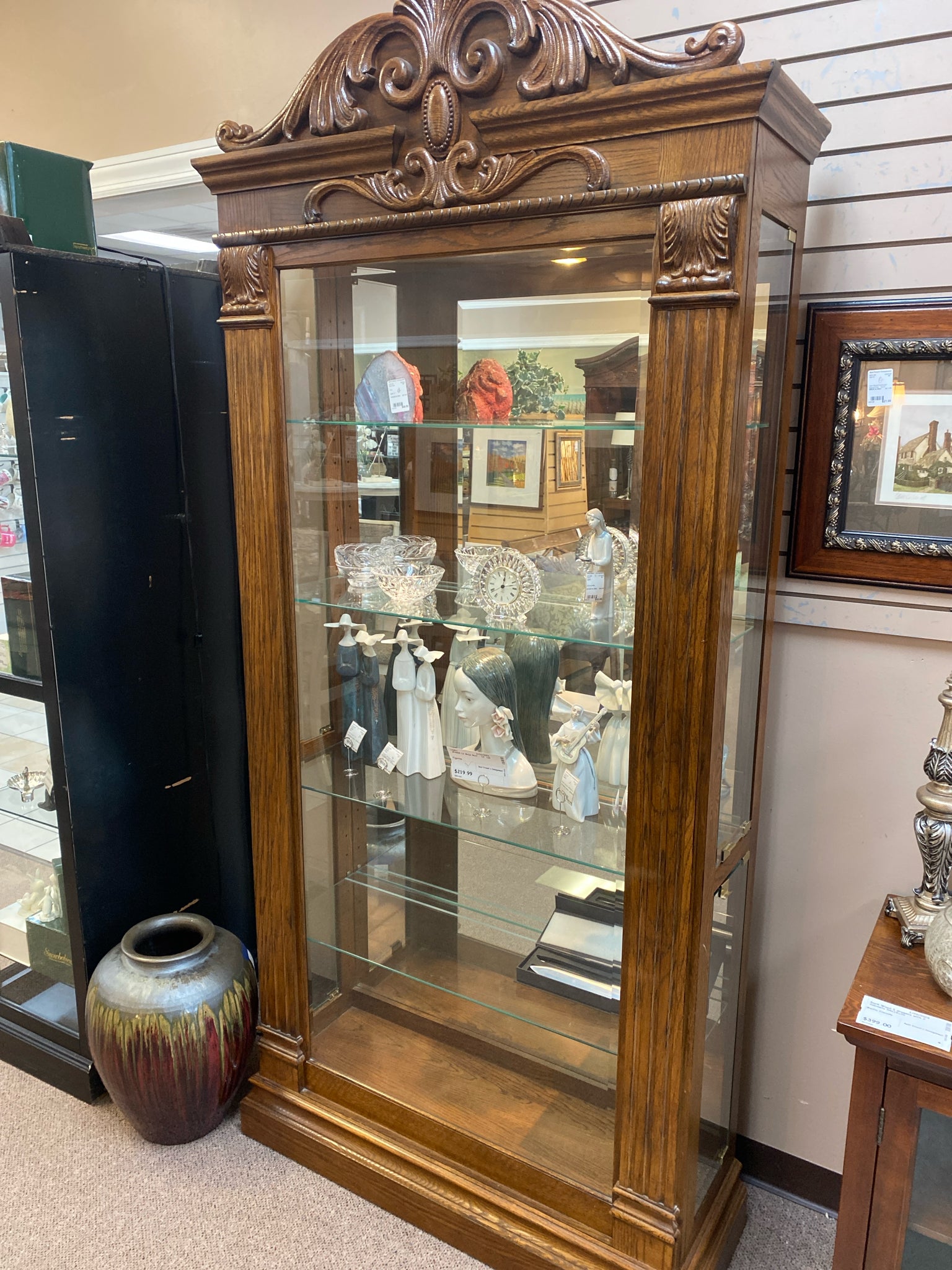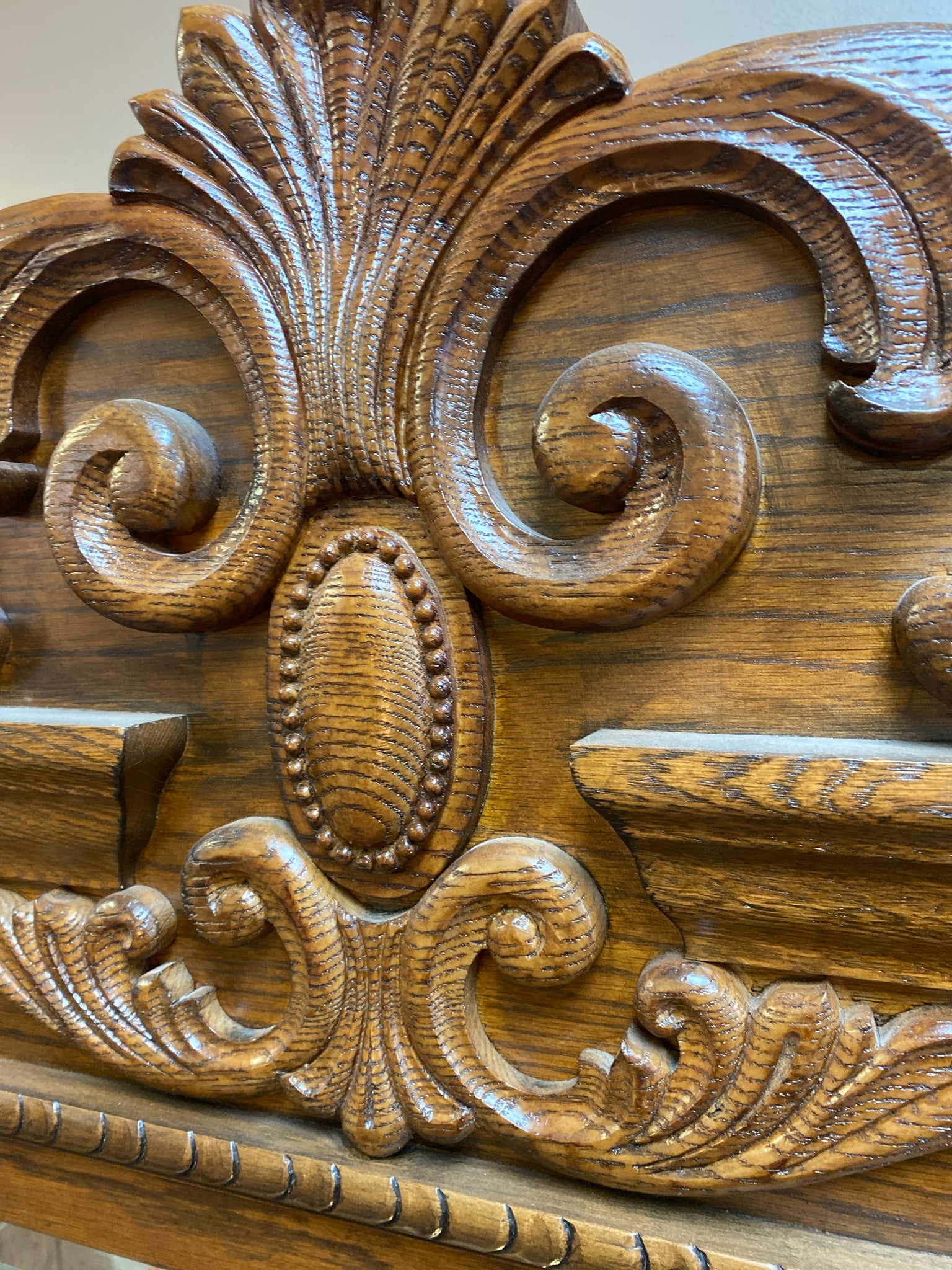 Oak Glass Shelves - Scrolling Carved Top- 43x14x92