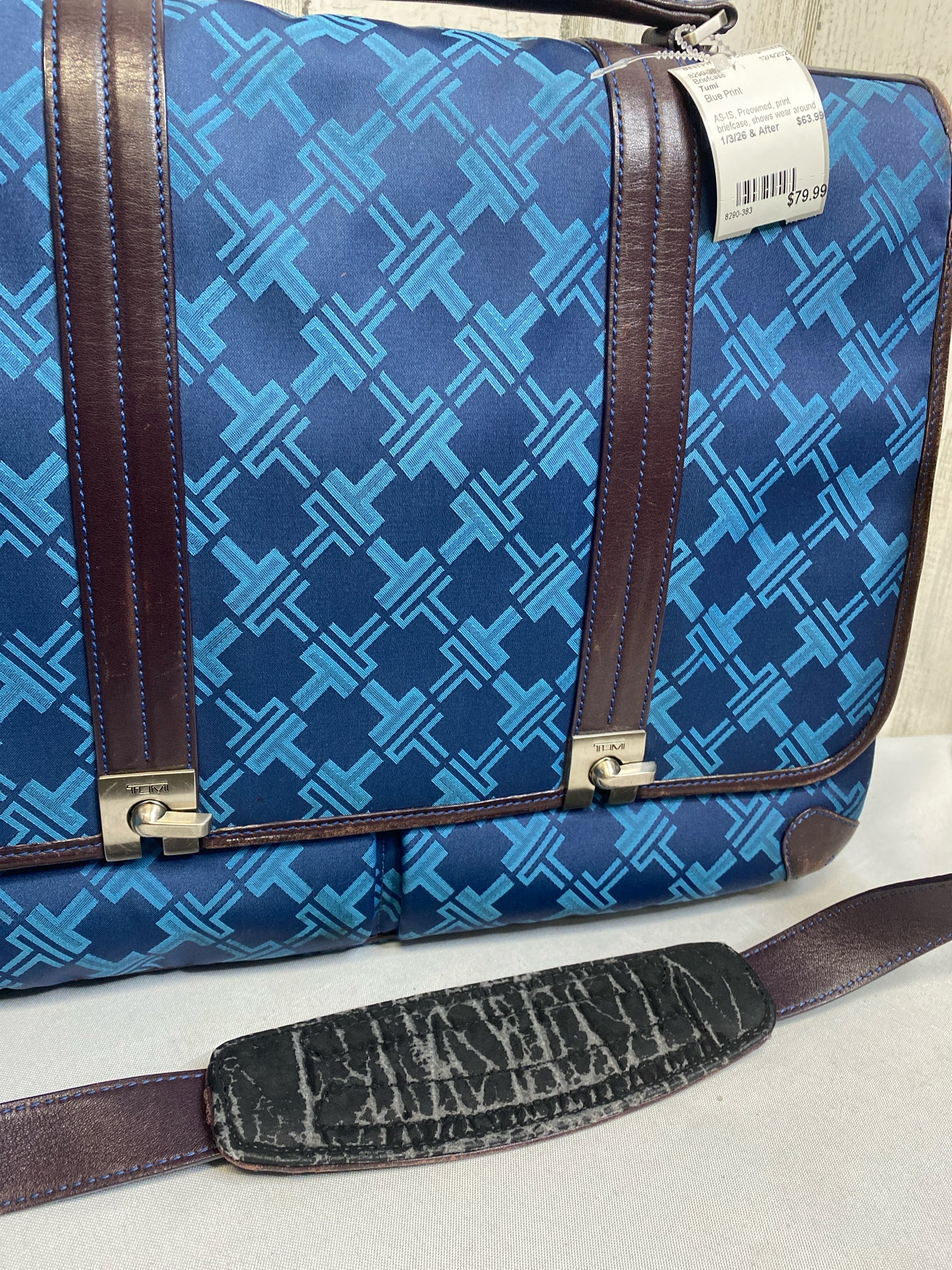 AS-IS, Preowned, print briefcase, shows wear around leather trim, inside is good.