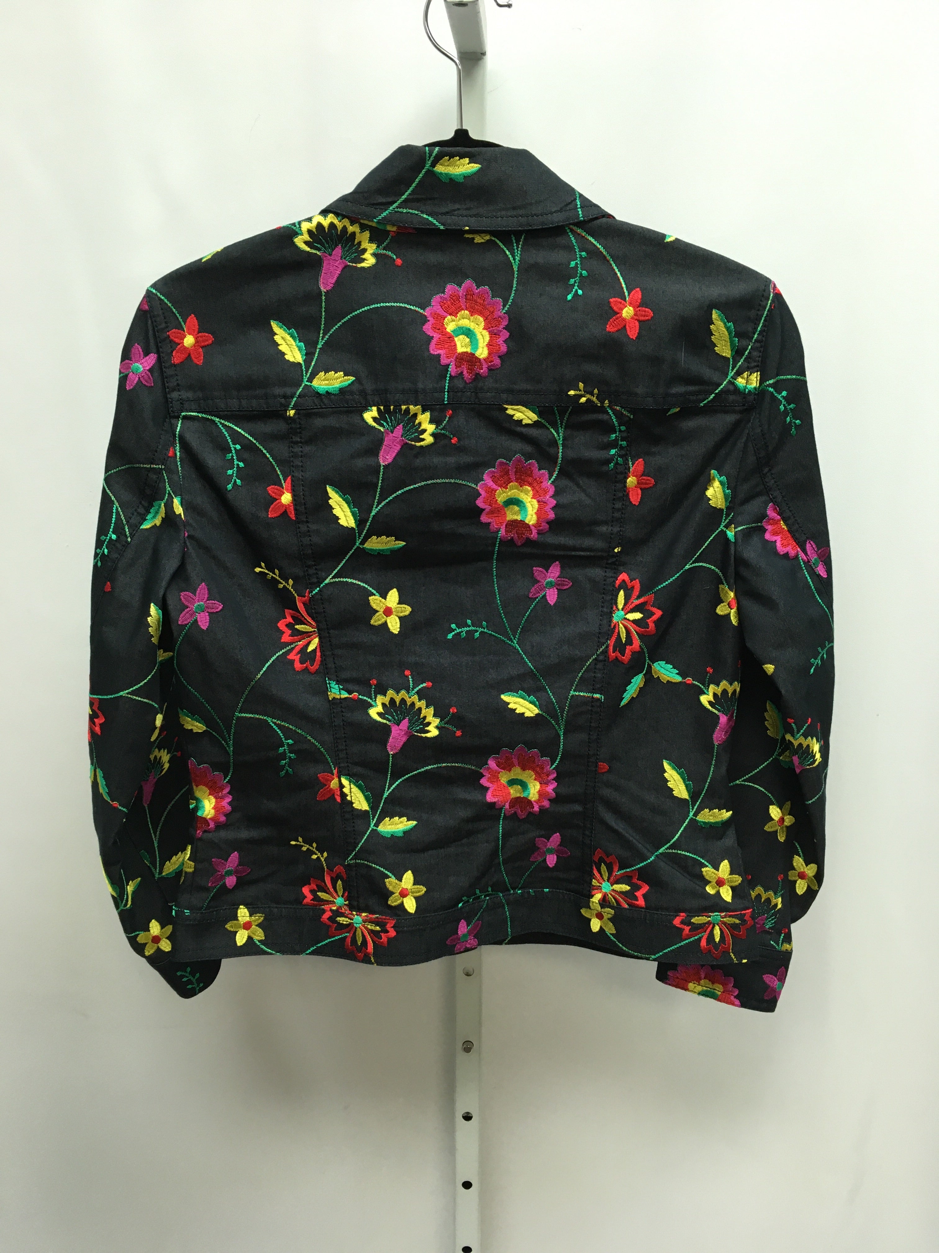 preowned, embroidered colorful flowers, button down, cotton./stretch